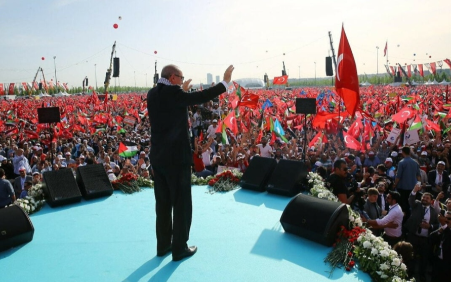 Erdoğan, partisinin İstanbul İl Başkanlığı tarafından düzenlenen ve Milliyetçi Hareket Partisi (MHP) Genel Başkanı Devlet Bahçeli, Büyük Birlik Partisi (BBP) Genel Başkanı Mustafa Destici, Hür Dava Partisi (HÜDA PAR) Genel Başkanı Zekeriya Yapıcıoğlu ve Demokratik Sol Parti (DSP) Genel Başkanı Önder Aksakal, Türkiye Büyük Millet Meclisi (TBMM) Başkanı Numan Kurtulmuş, Cumhurbaşkanı Yardımcısı Cevdet Yılmaz, KKTC Cumhurbaşkanı Ersin Tatar ve Filistin’in Ankara Büyükelçisi Faed Mustafa’nın kendisine eşlik ettiği “Büyük Filistin Mitingi”nde açıklamalarda bulundu.